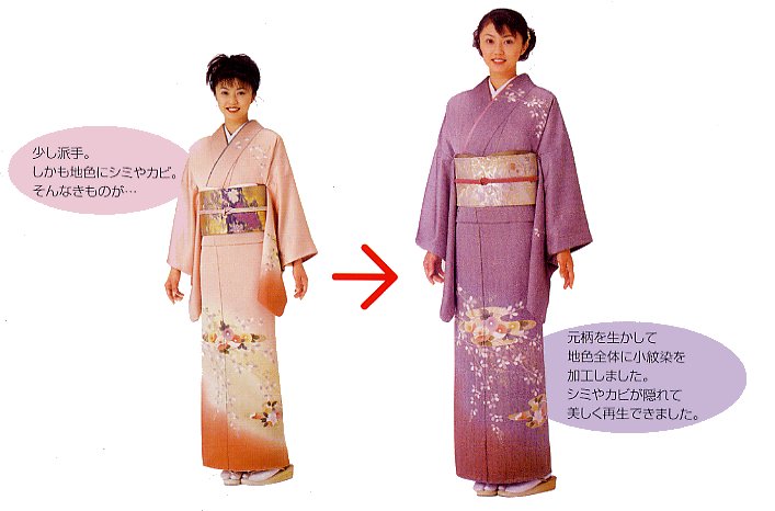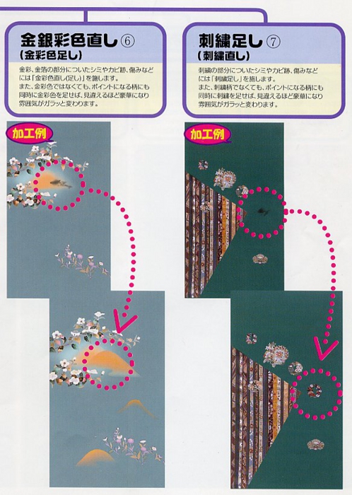 上記は加工例です。元柄を生かして地色全体に小紋染を加工しました。シミやカビが隠れて美しく再生出来ました。