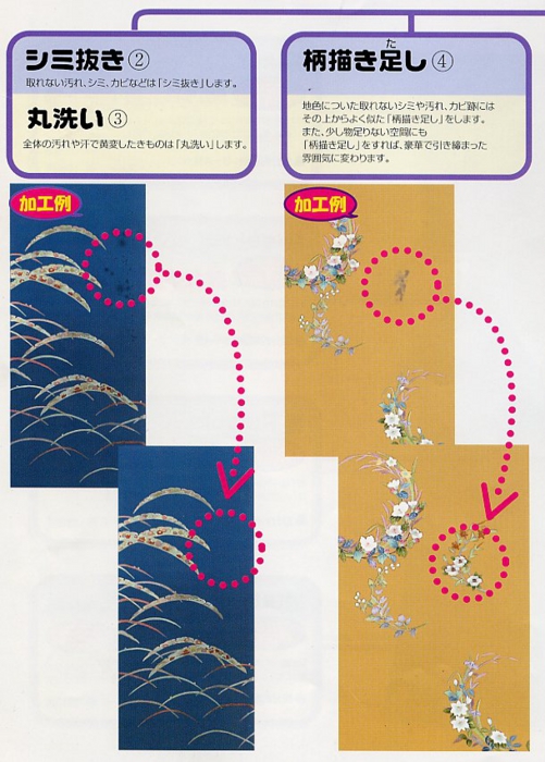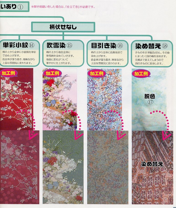 ● 柄の上から(柄伏せせずに)きもの全体を加工する。以上、2つの方法があります。